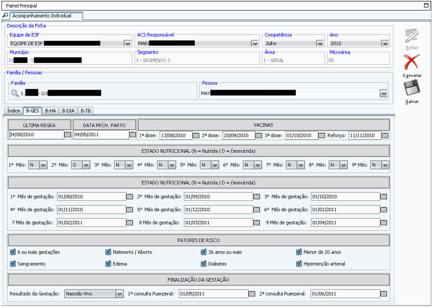 Ao selecionar determinada pessoa da família, o sistema identifica em qual grupo a mesma foi classificada e habilita as fichas de acompanhamento de acordo com a classificação.